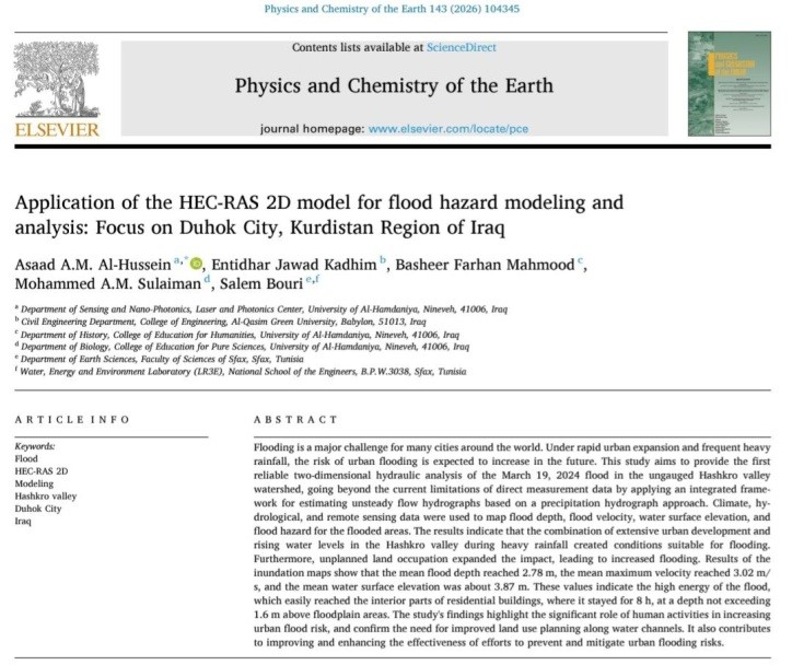حقق فريق بحثي من جامعة الحمدانية إنجازاً علمياً جديداً بنشر بحث في مجلة Physics and Chemistry of the Earth البريطانية والتابعة لدار النشر العالمية Elsevier . البحث الذي اشترك فيه كل من الأستاذ المساعد الدكتور أسعد أحمد مقداد / رئيس قسم التحسس والفوتونيات النانوية في مركزنا، والاستاذ المساعد الدكتور بشير فرحان محمود، والمدرس الدكتور محمد علي محمد، وبالتعاون مع المدرس انتظار جواد من جامعة القاسم الخضراء، والدكتور سالم بوري من الجمهورية التونسية، نُشر في مجلة مصنفة ضمن الربع الأول (Q1) في مستوعبات سكوبس وكلاريفيت (CiteScore = 6.8 , IF = 4.1) ، ويعدُ هذا الانجاز تأكيداً على الرصانة العلمية التي يتمتع بها الباحثون وتعزيزاً لمكانة جامعة الحمدانية / مركز الليزر والفوتونيات في المحافل الاكاديمية الدولية