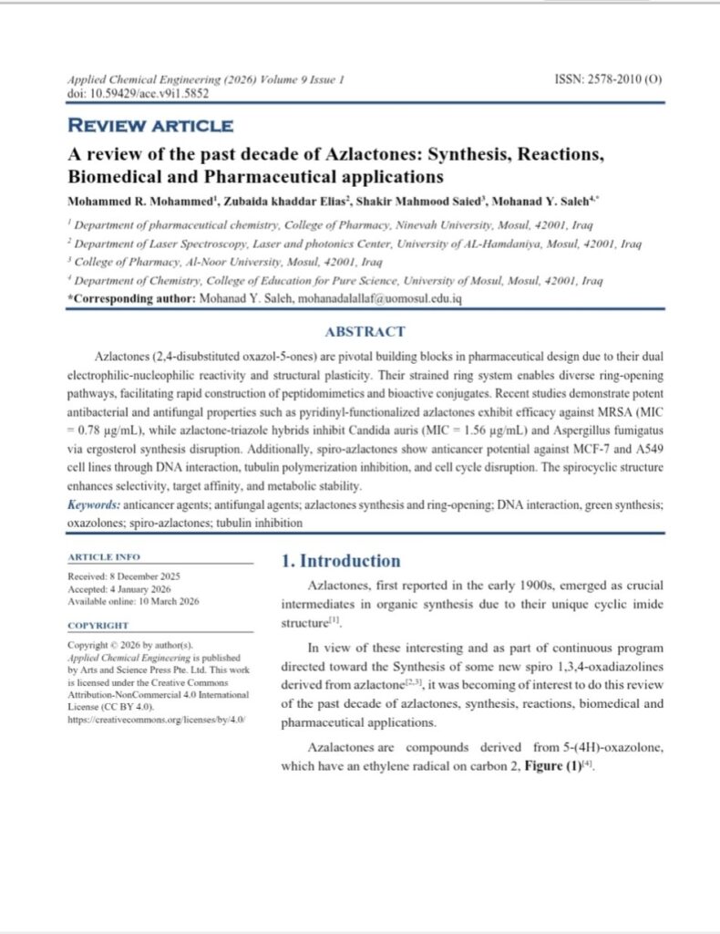 ضمن سعي الجامعة للارتقاء بالتصنيفات العالمية والنشر في المجلات ذات المستوعبات الرصينة ، حقق فريق بحثي محلي بينهم ( المدرس المساعد زبيدة خضر الياس التدريسية في مركز الليزر والفوتونيات / قسم الليزر والأطياف) انجازاً علمياً بعد نشرهم لبحث بعنوان ” مراجعة للعقد الماضي من تاريخ الأزلاكتونات : التخليق ، التفاعلات ، التطبيقات الطبية الحيوية والصيدلانية ” في مجلة عالمية ضمن مستوعبات سكوبس ( الربع الرابع Q4) ويعد هذا الانجاز تأكيداً على الرصانة العلمية التي يتمتع بها الباحث وتعزيزاً لمكانة جامعة الحمدانية / مركز الليزر والفوتونيات في المحافل الاكاديمية الدولية …